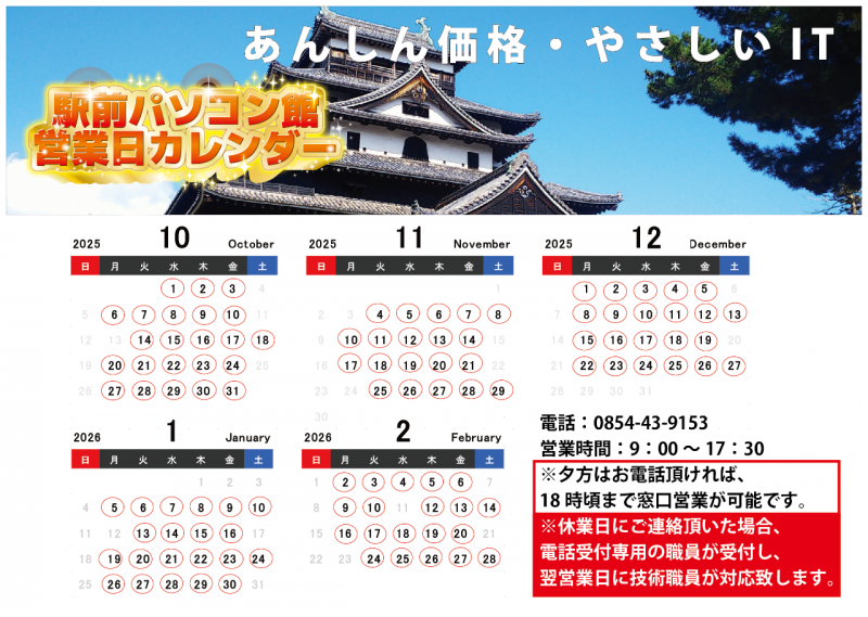 2025年度10月~2月の営業日のお知らせ