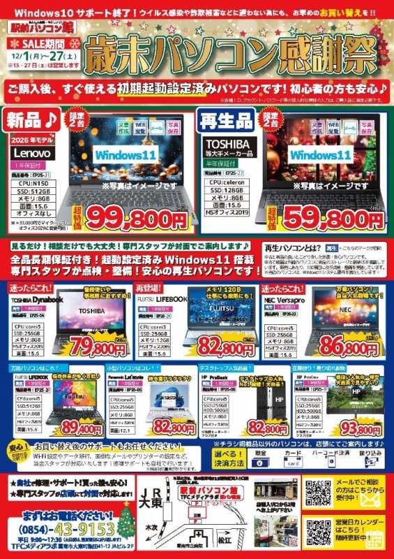 【パソコンセール】 post by TFCメディアラボ | On 2025.12.2 | in 12月27日までパソコン買い替え大特価フェア開催中 ■■■Windows10サポート終了■■■ ウイルス感染リスク増!!! WEBサービスが利用できないトラブル増!! 乗り換えの設定は大得意♪ のお手伝いならお任せあれ。