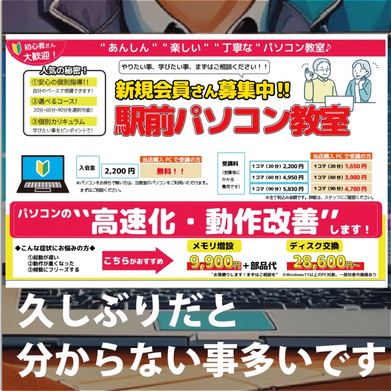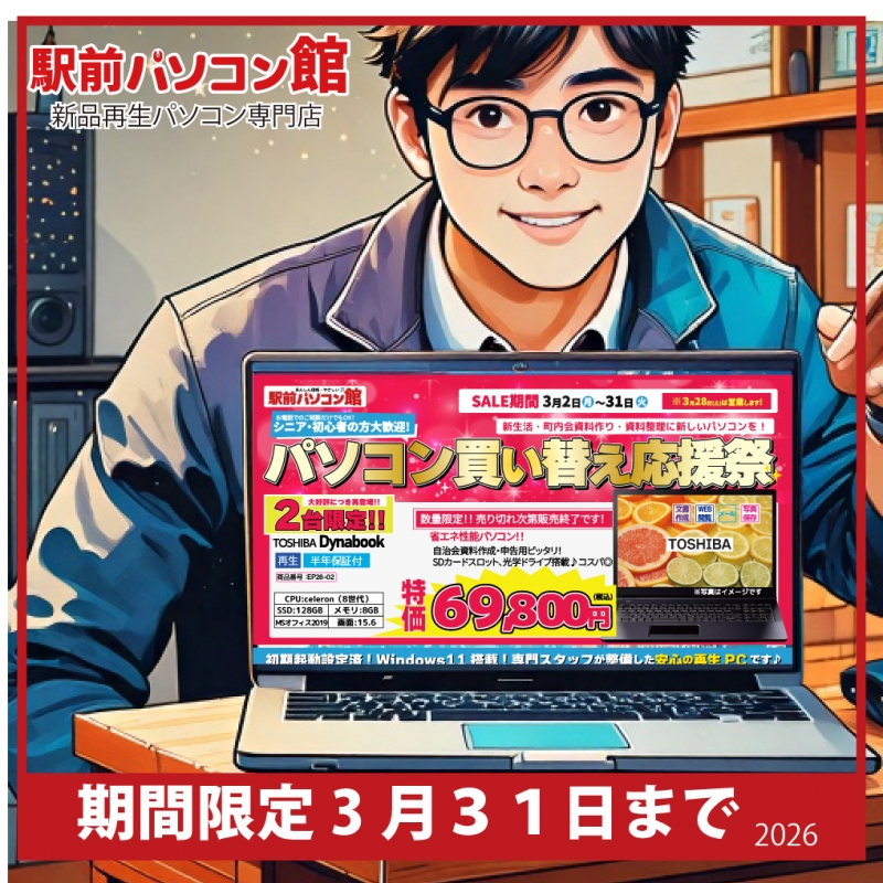 【パソコンセール】3月の売り出しについて post by TFCメディアラボ | On 2026.3.6 | in お知らせ 【パソコンセールやってるよー!】 3月の売り出し情報です。 3月31日までパソコンが超お得にゲットできるチャンス! 半導体価格が高騰中なのにこの価格! 修理もおすすめ! ご購入はお早めに!